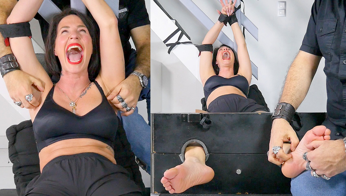 The hysterically ticklish Milf Helina is now strongly immobilized with her arms up and her sexy feet locked in the stocks. She is at the mercy of two experimented ticklers who tickle her to her real ticklish limits. The first half of the clip is focused on her upperbody then the second half is an extremely intensive bare feet tickling punishment. Helina goes crazy all long the clip under these sadistic tickle fingers and tools who run on her most sensitive areas. There is absolutely no ways to escape or to stop the tickles and this situation is absolutely unbearable for the girl who lose all control of herself.
